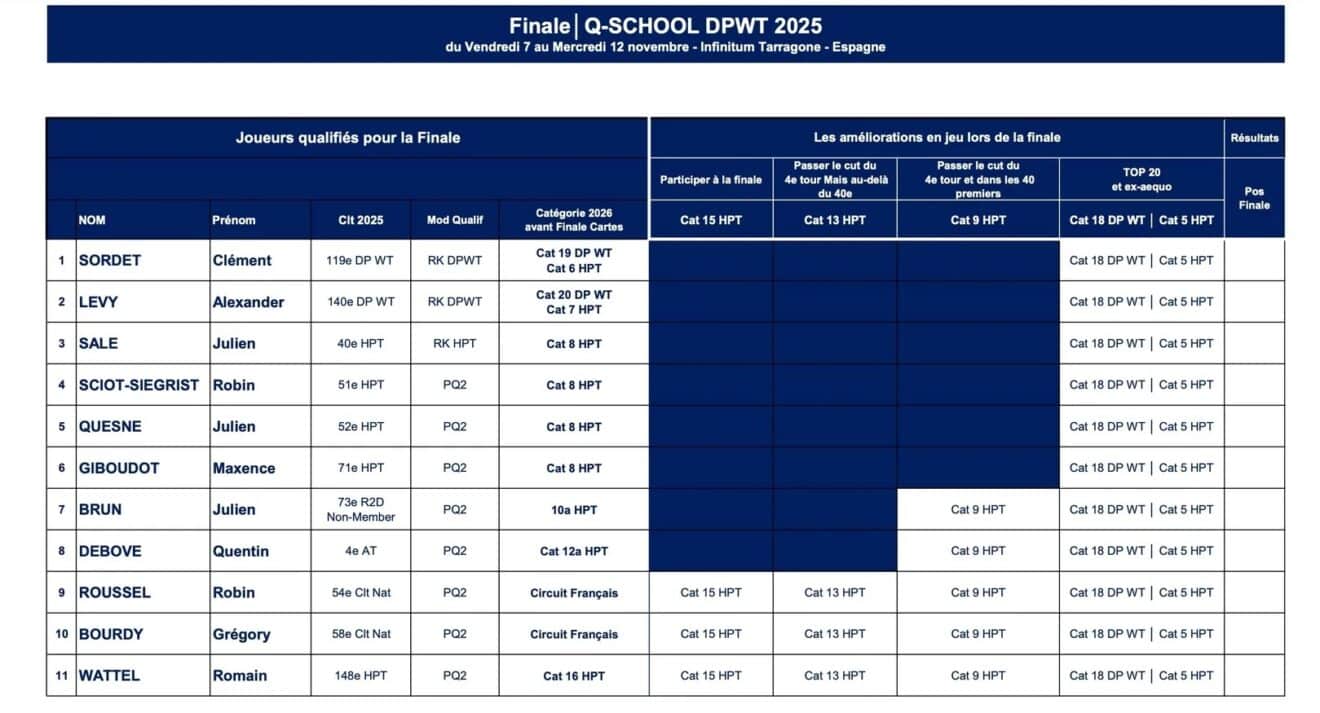 A l’issue de ce marathon des PQ2, on connait maintenant les joueurs français qualifiés pour les PQ3, Final Stage. Ils sont au nombre de 8 : Grégory Bourdry, Pierre Pineau, Grégory Havret, Mathieu Deconttignies Lafon, Clément Guichard, Maxence Giboudot (a), Robin Roussel et Alexandre Daydou.